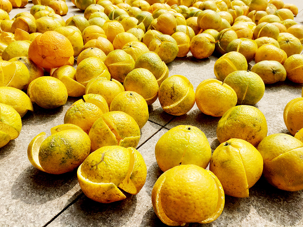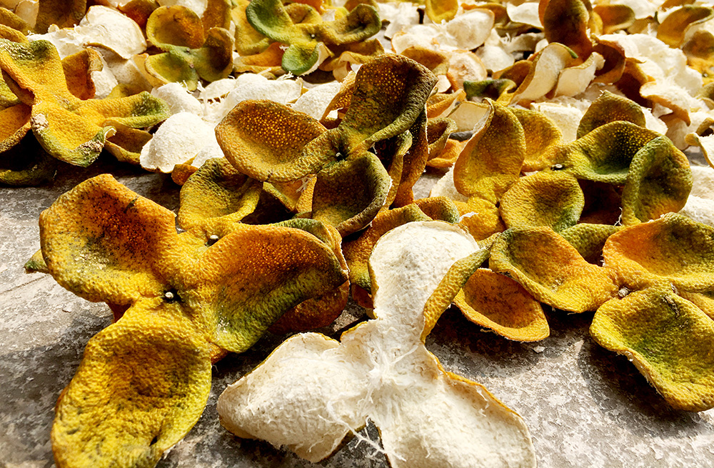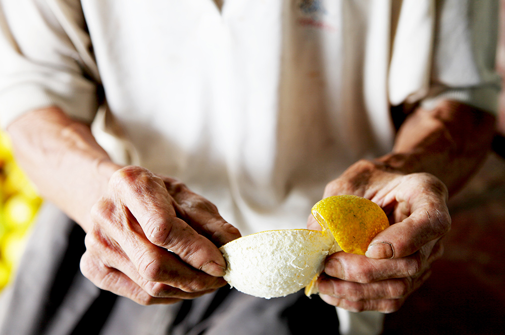 何伯說,陳皮就要在水泥地上平鋪開,讓太陽(yáng)自然而然的曬,自然曬干的陳皮,吸收了太陽(yáng)光的干爽,自然脫水并收縮,入罐或者是入箱封存,這樣才不會(huì)發(fā)霉,想吃或者想煮時(shí)候,拿出一塊,洗干凈皮囊,就可以了!