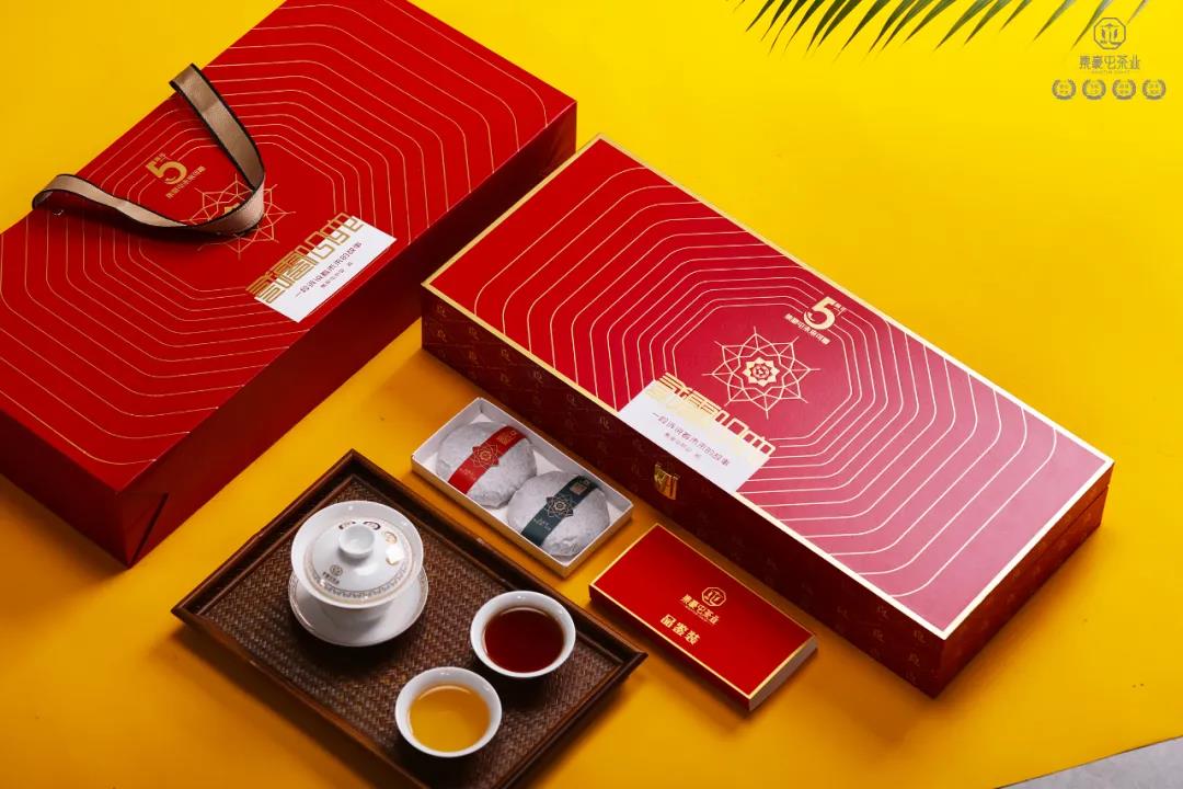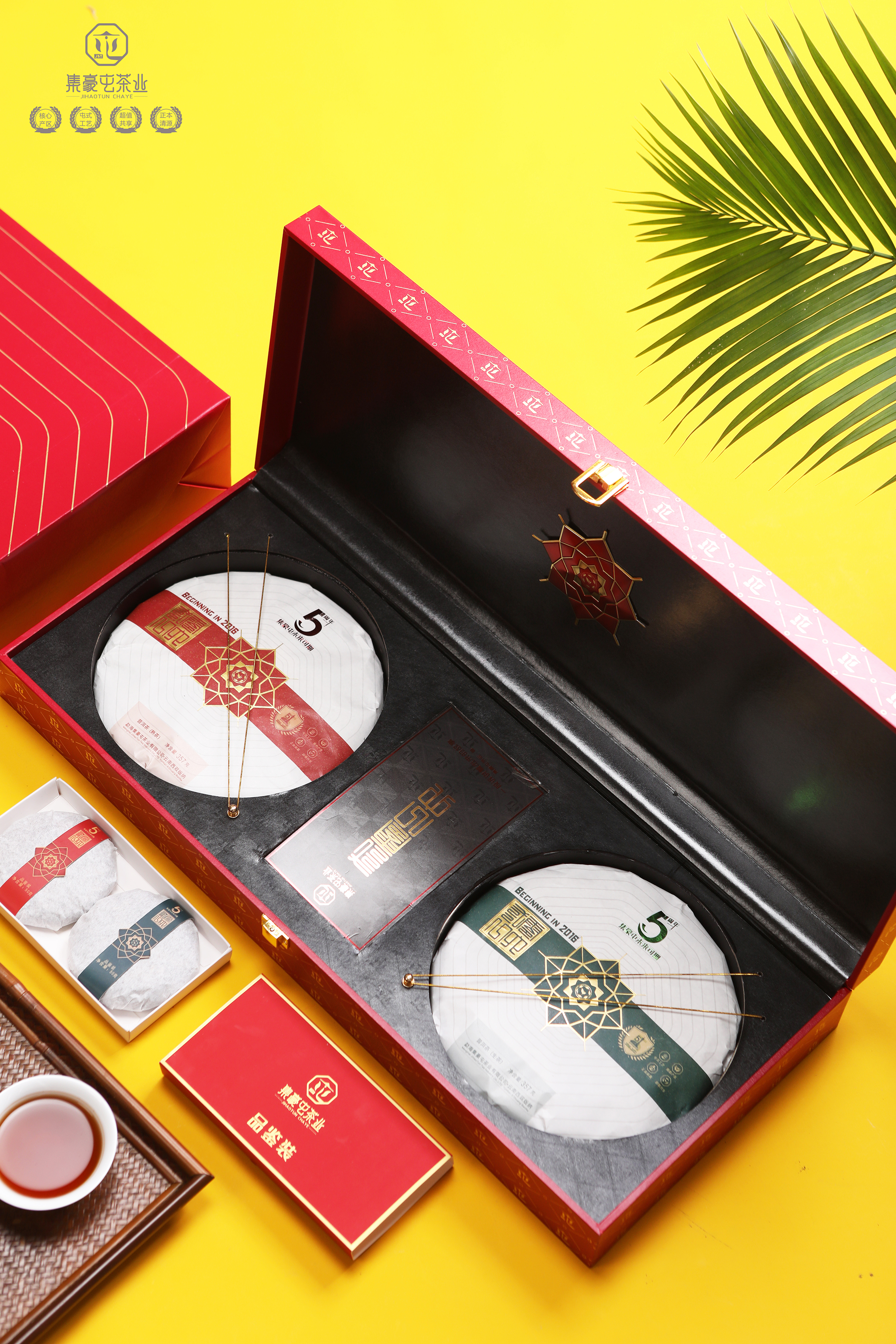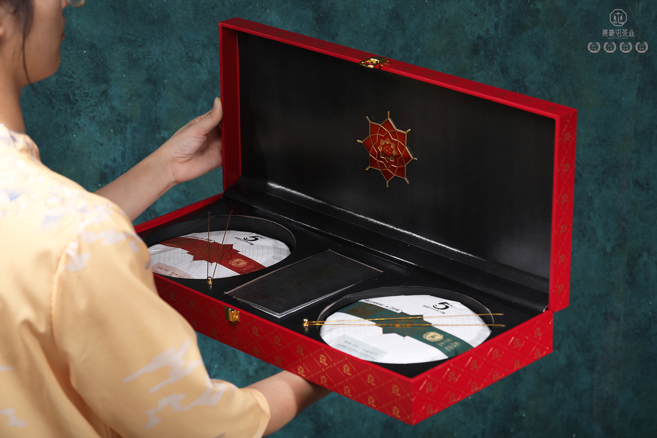 獨特的鎖扣打開方式,富有神秘感又高級。揭開「二零一六」禮盒的神秘面紗,左右兩側的一生一熟茶餅。青色為生茶,紅色為熟茶。白色的八邊形底紋無限放大,仿佛在訴說著集豪屯未來的無限發展。
