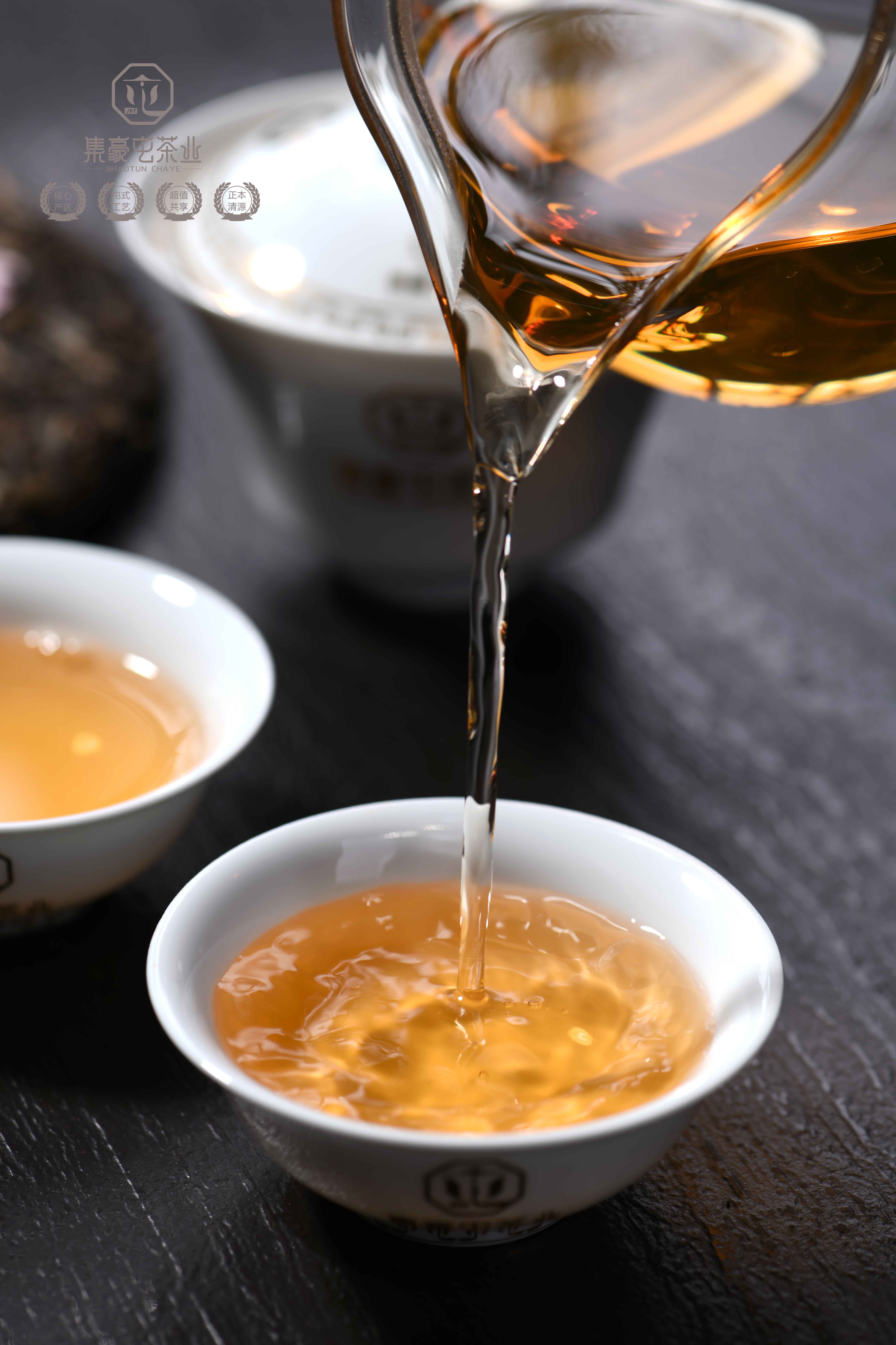 準(zhǔn)備好的沖泡茶具和學(xué)校的相比有很大差異,少了茶濾卻又多了一個(gè)公道杯。師姐一邊沖泡“得樂(lè)”一邊和我介紹集豪屯的“屯式”泡法,先洗再潤(rùn)更能快速激發(fā)茶葉的香氣和滋味,使茶葉的耐泡度大大提升。省去茶濾是因?yàn)榧劳筒枞~加工的過(guò)程中要嚴(yán)格把控茶葉衛(wèi)生與食品安全,茶餅的條索勻齊,易撬取,這大概就是師兄話中的獨(dú)特壓餅技術(shù)。兩個(gè)公道杯其中一個(gè)用于熱嗅、溫嗅和冷嗅,便于考察茶葉香氣的高低和持久度,另一個(gè)用于出湯分茶。