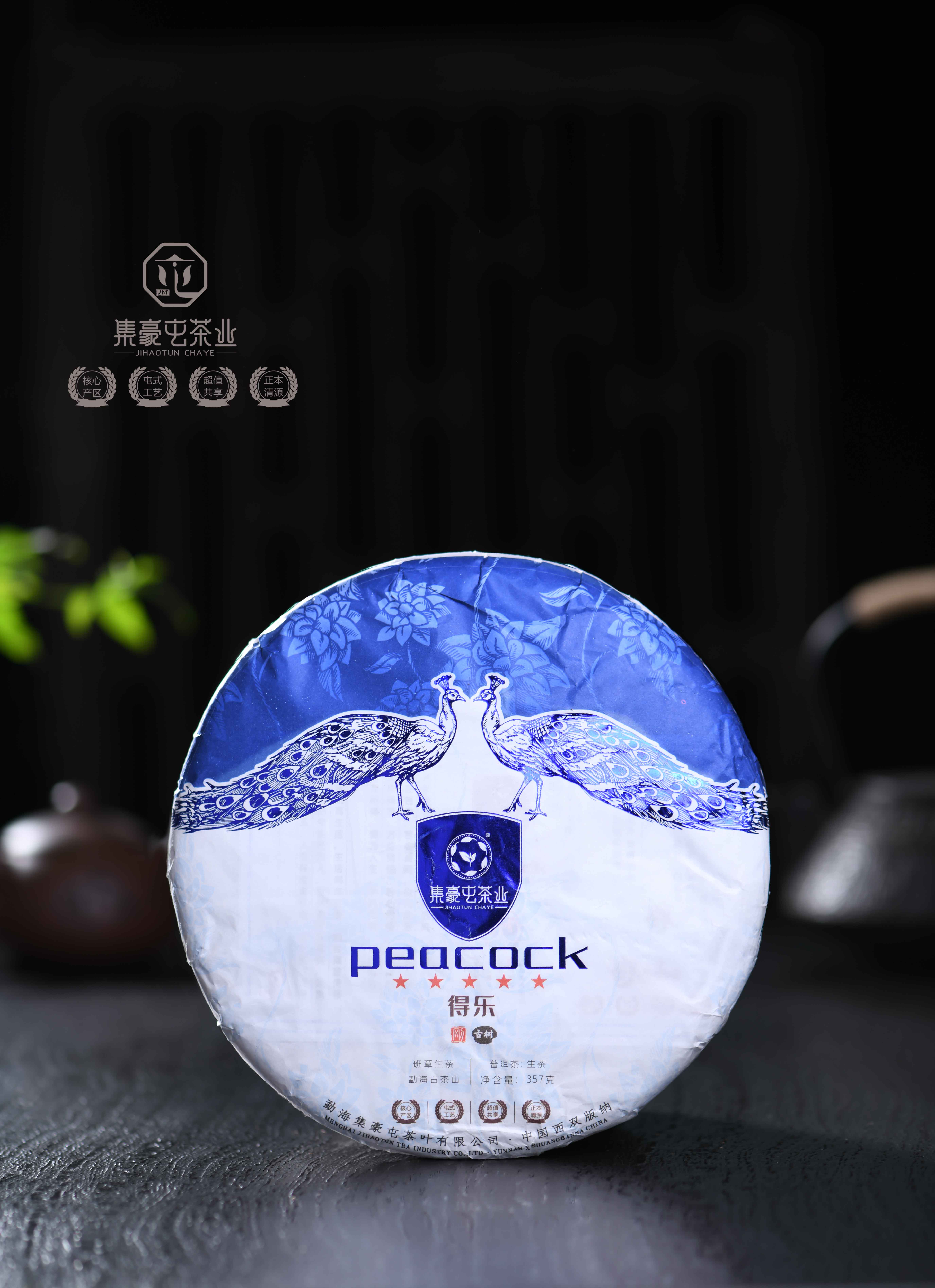 這次以小茶客的身份來(lái)到集豪屯,以茶待客選好茶,師兄熱情的拿出了名為“得樂(lè)”的一款生茶,版面以藍(lán)色為主色調(diào),藍(lán)色更突顯孔雀的優(yōu)雅與高貴,師姐說(shuō)這款茶是采用純古樹(shù)、純班章原料壓制而成,我雖在學(xué)校對(duì)茶的接觸不深,但我知道班章在普洱界是赫赫有名的。現(xiàn)在細(xì)看,藍(lán)色Logo的燙金顯得格外耀眼。