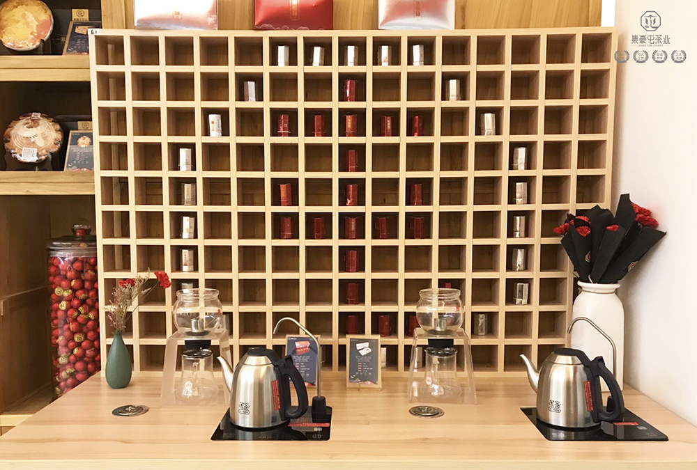 走進(jìn)之后馬上有人接待,我細(xì)細(xì)地看著展柜上陳列的茶品,還有由茶品陳列出來(lái)的大大的“屯”字。經(jīng)店員介紹,我知道了那一筒筒的小茶品叫做集相隨。那一個(gè)個(gè)大桌子,叫做共享茶臺(tái)。