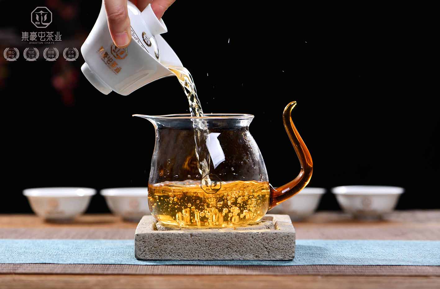 一個透明的公道杯,能充分的展現茶湯的狀態,其顏色、亮度及通透感,都能讓人一目了然。集豪屯的公道杯,采用鷹嘴狀壺嘴,出水流暢,斷水利落。其特殊的材質,使得它直接放于電陶爐上煮也不會爆裂。